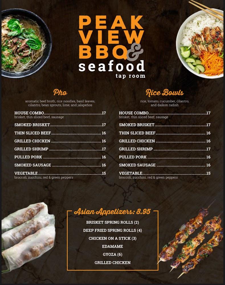 The menu at Peak View BBQ & Taproom is an exciting blend of BBQ, seafood, pho, and comfort dishes. Signature items like the brisket sandwich and seafood boils stand out. Diners can also enjoy unique pho offerings; each bowl bursts with flavor. Asian appetizers like gyoza and chicken on a stick offer delightful starts to any meal.